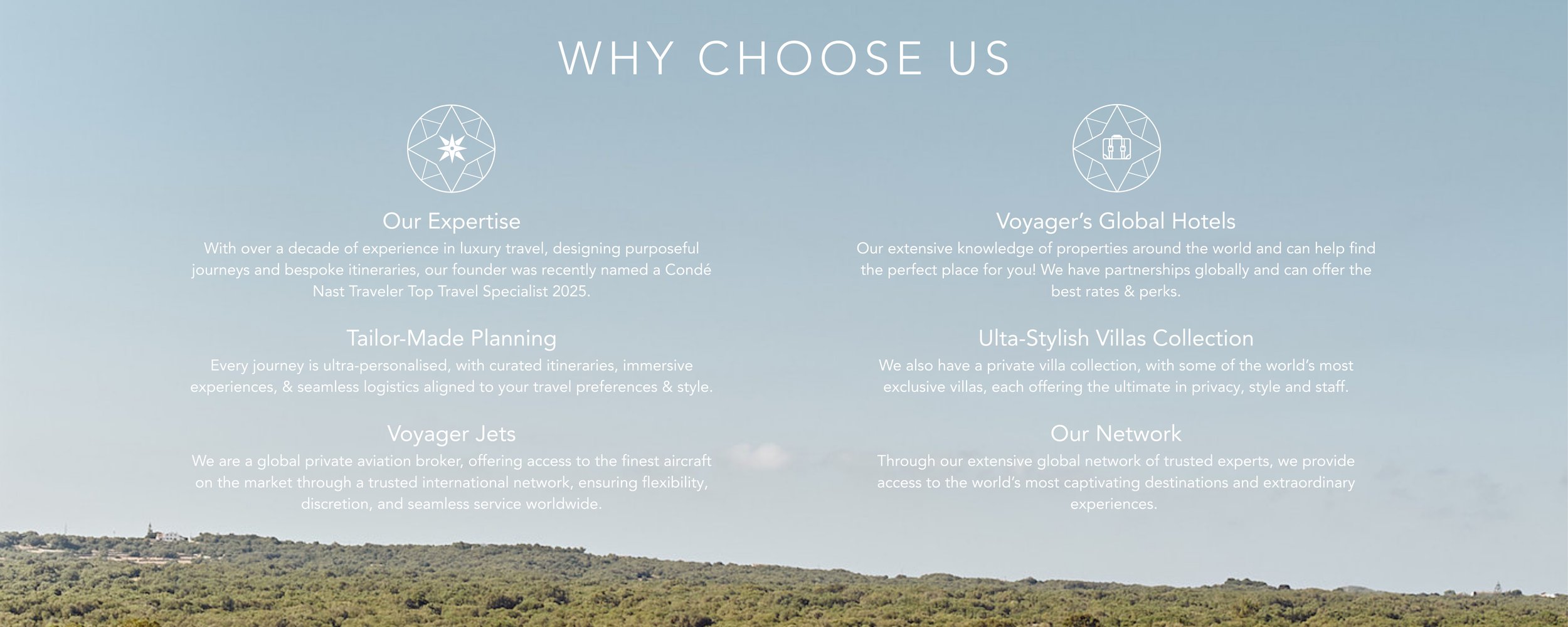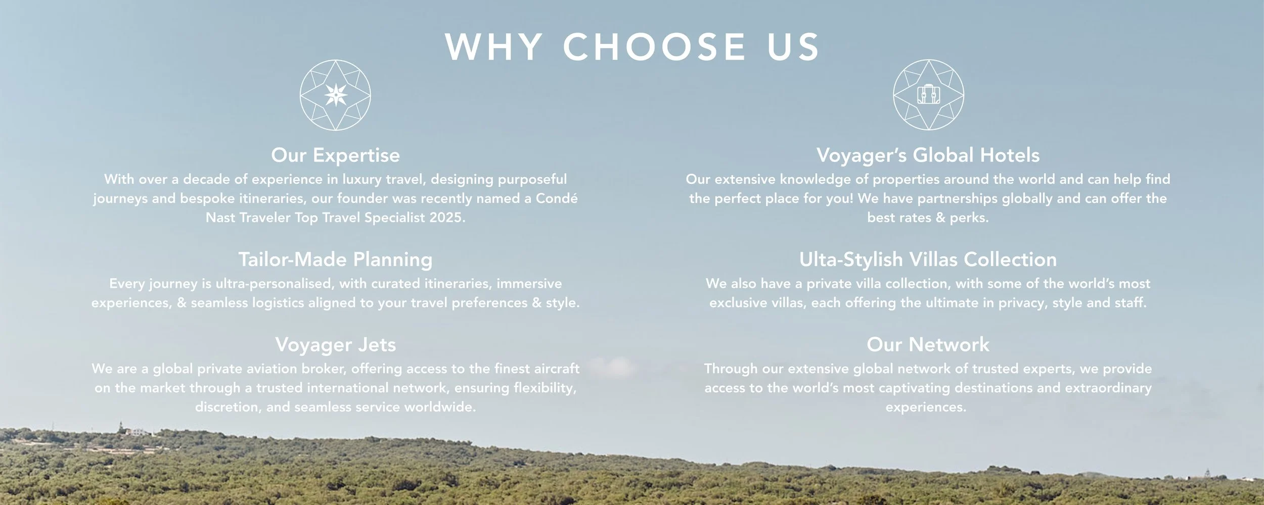 Voyager Club is a luxury travel company delivering ultra-curated experiences with a hyper-personal touchpoint. We design purposeful journeys with bespoke itineraries, taking care of every detail from planning your dream getaway to ensuring a seamless and memorable experience. Our services are available on an enquiry basis or through membership, tailored to the needs of high-net-worth individuals and families.
