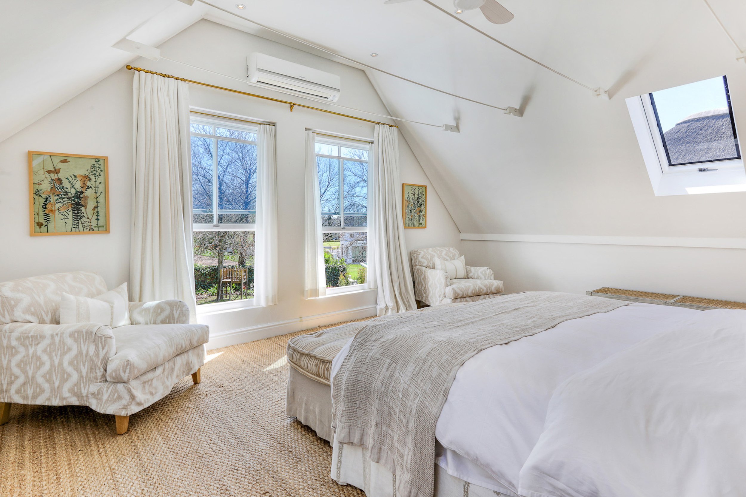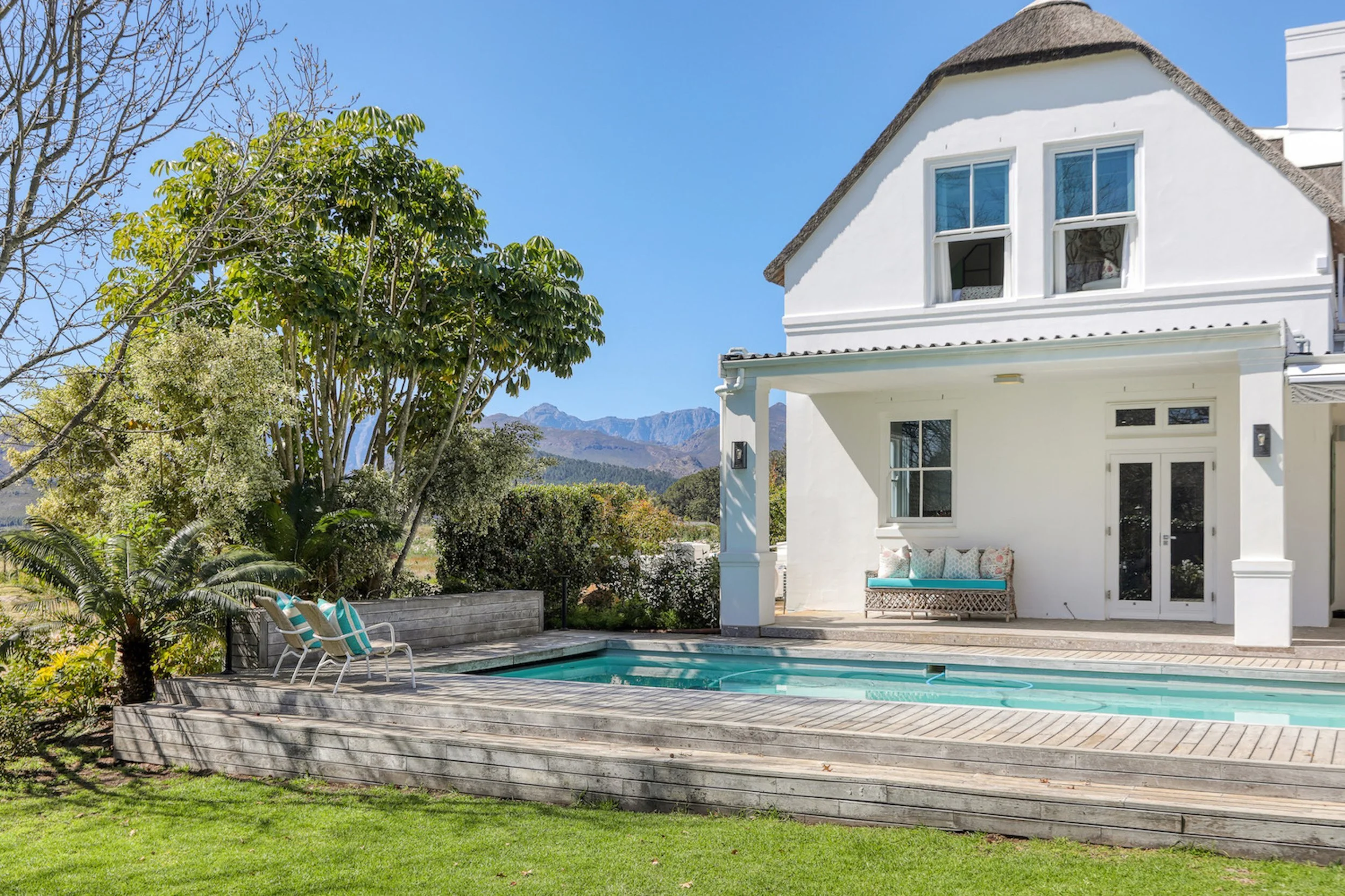 This charming country house in Franschhoek offers four beautifully renovated bedrooms, blending rustic Cape Dutch architecture with modern comforts. Surrounded by vineyards and mountains, Bellevista is the perfect place for wine lovers and those wanting to unwind in scenic surroundings. Enjoy relaxing days by the pool, wine tastings at nearby estates, and access to a shared tennis court. The estate is close to renowned attractions like the Boschendal wine estate, known for its vibrant food market and trails.